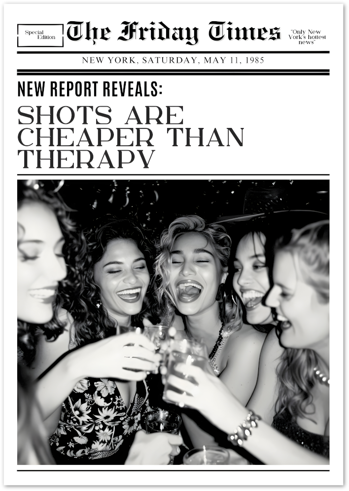 A group of friends clinks their shot glasses in celebration under a vintage-style newspaper headline. Joyful, feminine, and full of life.