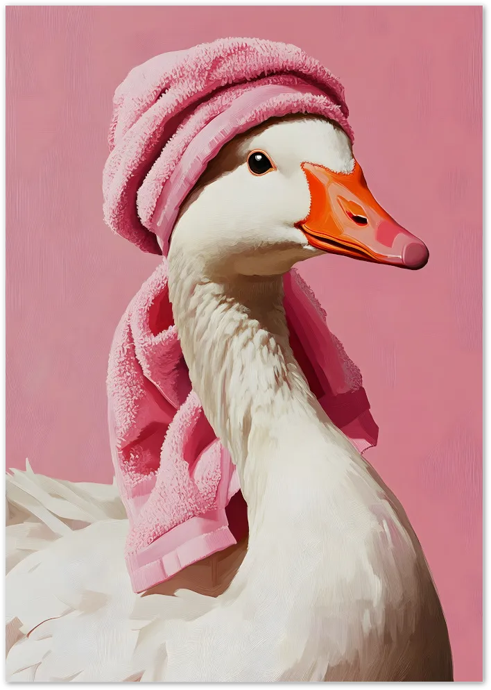 A serene white goose wrapped in a cozy pink towel evokes ultimate spa-day relaxation. Chic, calm, and surprisingly stylish.