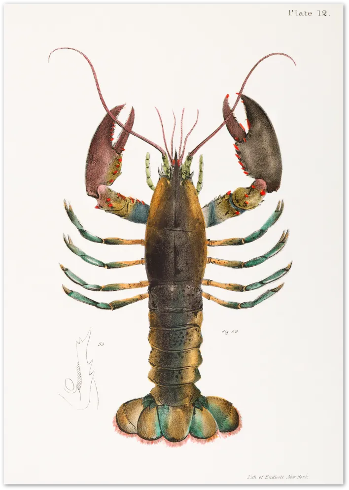 A vintage illustration of a lobster, detailed with scientific markings and classic typography. Coastal, educational, and utterly charming.