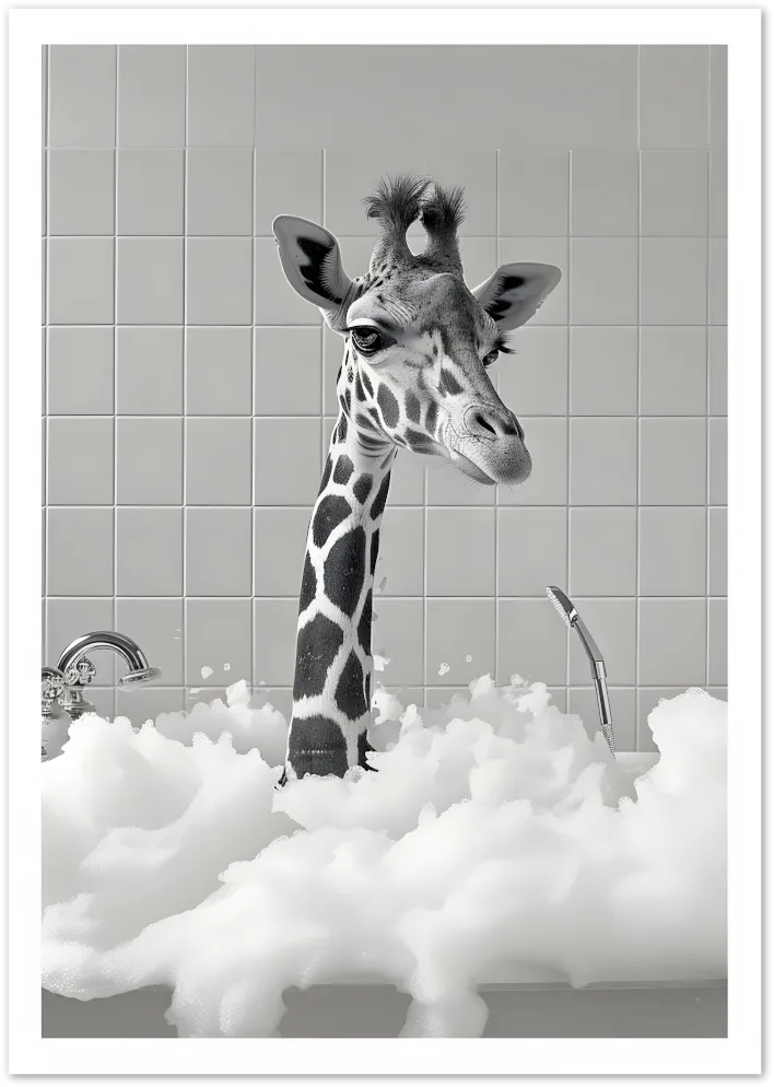 A tall giraffe peeks out from a bubble-filled bathtub in a tiled bathroom, blending surrealism with humor in a sleek grayscale palette.