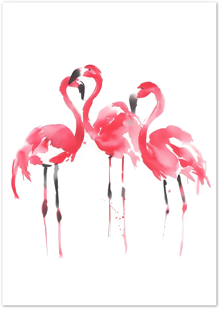 Three flamingos come to life in soft pink watercolor against a bright white backdrop. This poster blends elegance and minimalism for a modern tropical touch.
