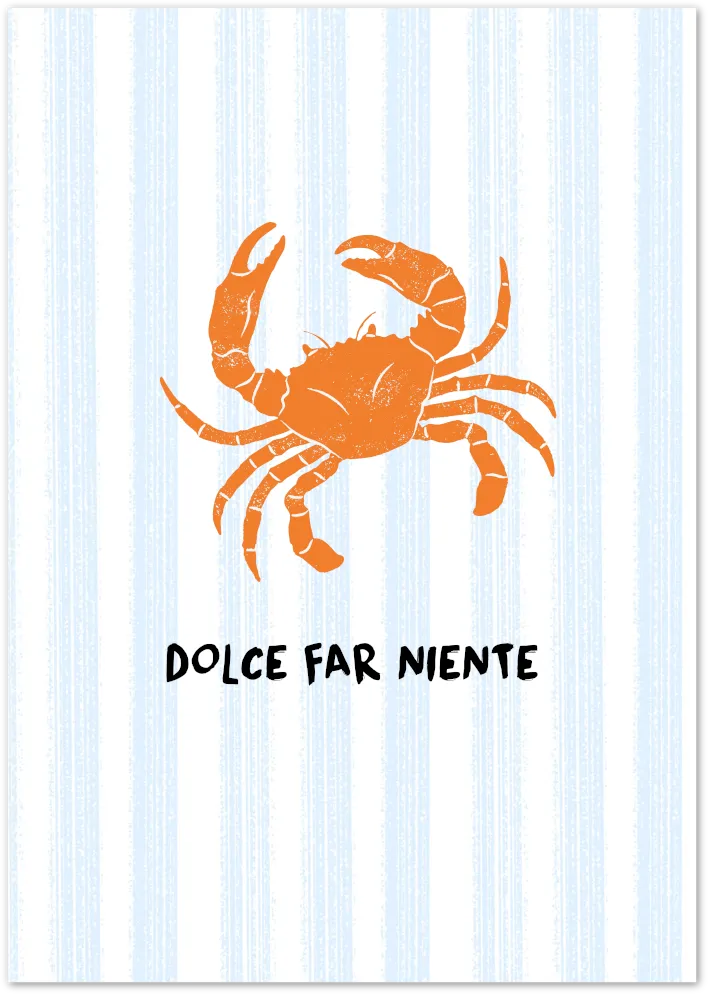 Featuring a charming orange crab on beachy blue-and-white stripes, this playful poster brings Italian coastal humor with the phrase “Dolce far niente” — the sweetness of doing nothing.