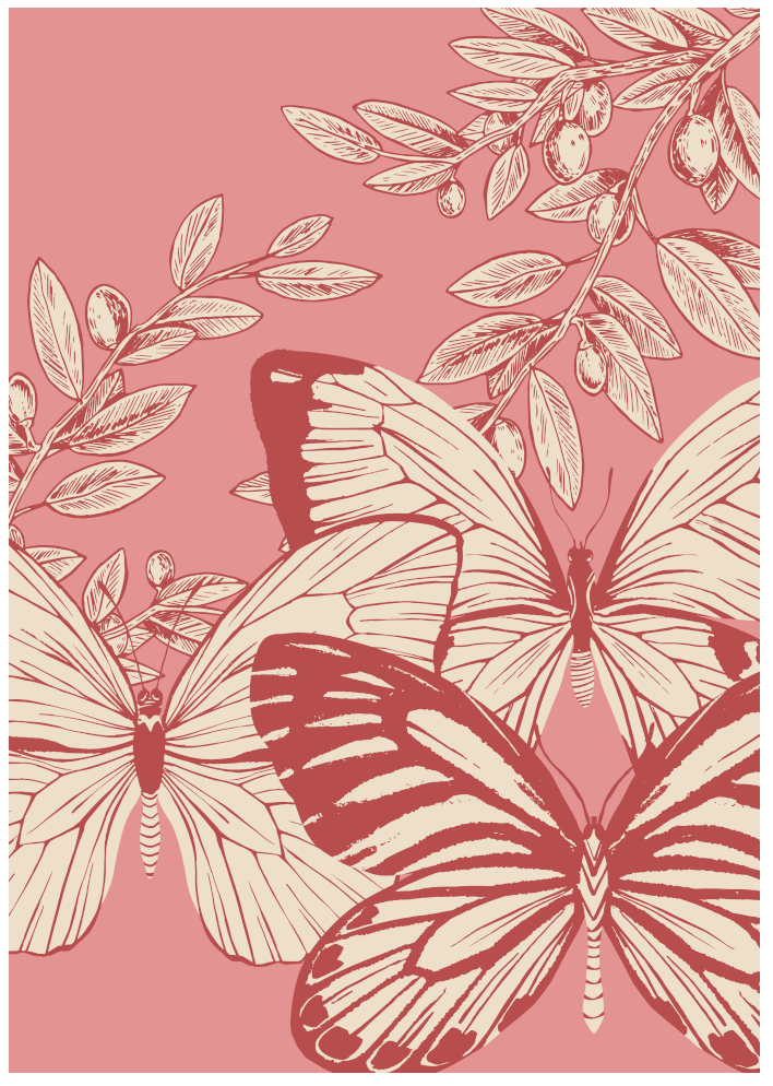 A decorative butterfly poster featuring detailed vintage-style illustrations on a warm pink background. Perfect for adding elegance and softness to your interior.