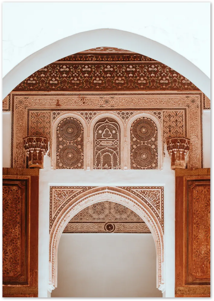 Experience the timeless elegance of Moroccan design with this stunning architectural archway print. The intricate carvings, warm earthy tones, and symmetrical details make this artwork a refined and culturally rich statement piece for any space.