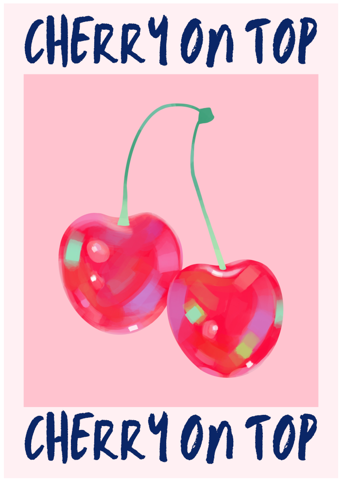 A playful poster featuring glossy cherry illustrations in vibrant pink and red tones. Fun, bold and perfect for kitchens, cafés or colorful interiors.