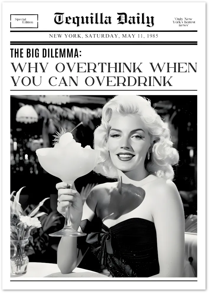 Styled like a vintage tabloid, this black-and-white poster delivers punchy humor with a glamorous twist. The quote says it all: “Why overthink when you can overdrink?”