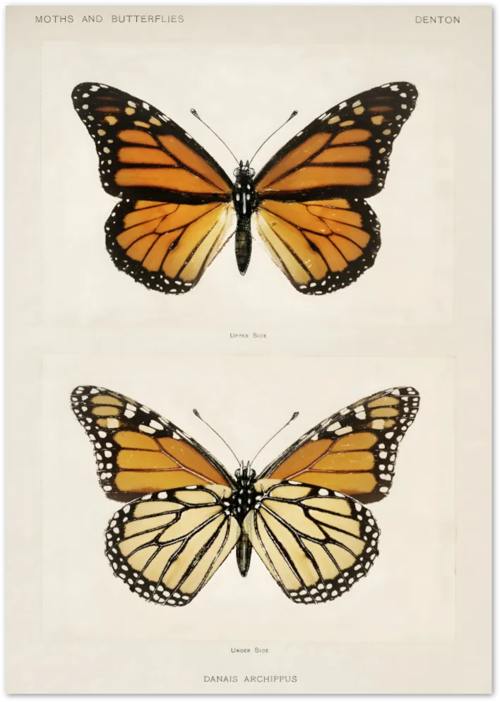 This botanical-style poster features a scientific rendering of a monarch butterfly’s upper and underside—ideal for vintage lovers, naturalists, or serene spaces.