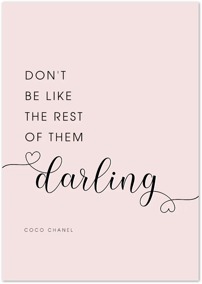 A stylish and empowering typography poster featuring the inspiring quote by Coco Chanel: "Don't be like the rest of them, darling." Set against a soft blush pink background, perfect for fashion lovers and minimalists.