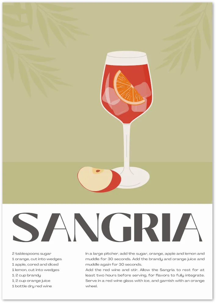 Celebrate the fruity freshness of sangria with this illustrated poster featuring a detailed recipe and a vibrant glass of the classic Spanish cocktail. Perfect for kitchens or home bars