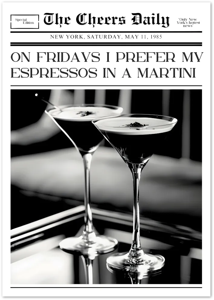 Inspired by retro headlines, this black-and-white print announces your Friday ritual in style: “On Fridays I prefer my espressos in a martini.” Sophisticated with a wink.