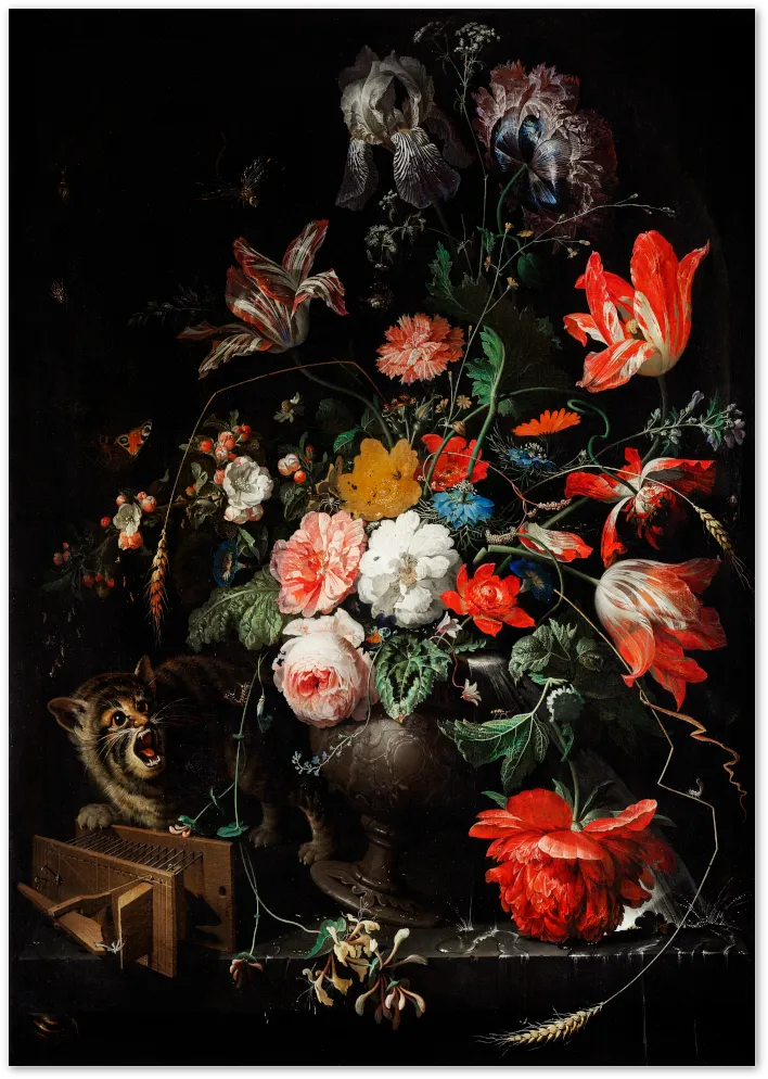 Celebrate the beauty of classical still-life paintings with this stunning floral composition. Rich colors and intricate details make this piece a timeless addition to any art collection.