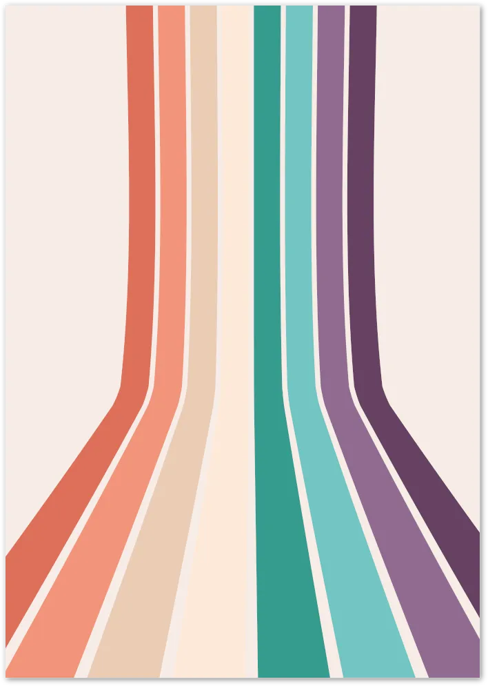Curved retro stripes in warm and cool tones flow downward in this vintage-inspired design. A nostalgic nod to 70s interiors in a modern art poster.