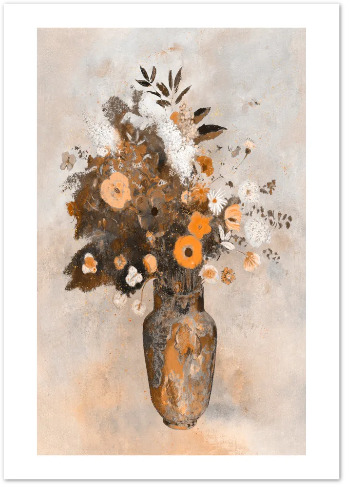 Warm earth tones and textured brushstrokes bring this still life vase of flowers to life. A muted yet expressive floral poster that complements natural interiors.
