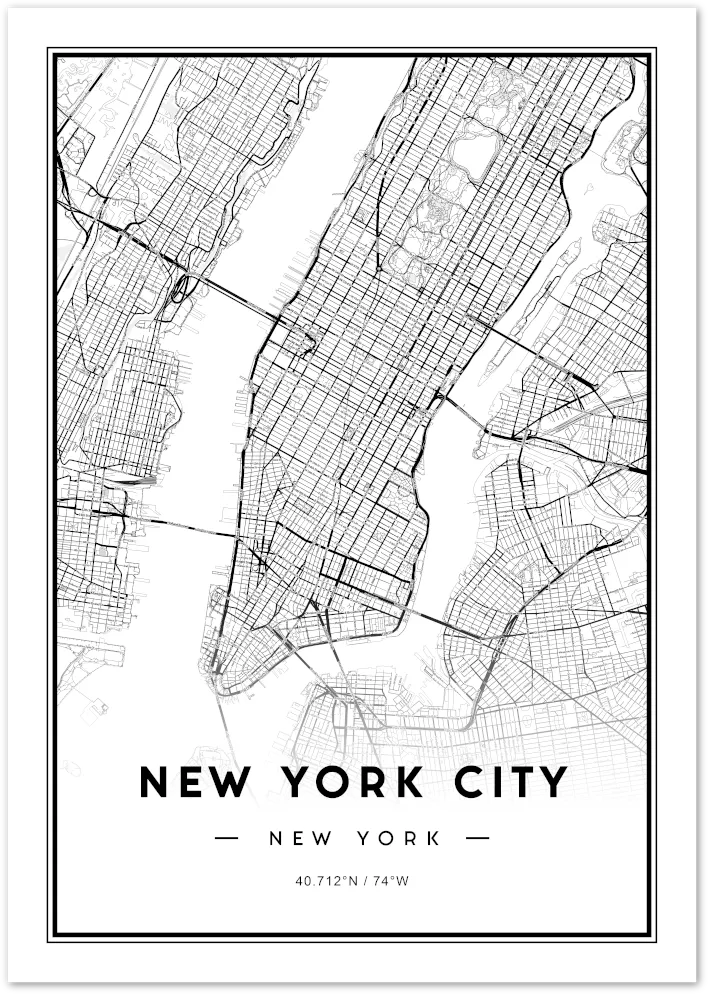 Een gedetailleerde en stijlvolle kaart van New York City, perfect voor liefhebbers van strak, minimalistisch design. De heldere zwart-wit lay-out benadrukt de complexe stratenpatronen van deze wereldberoemde metropool.