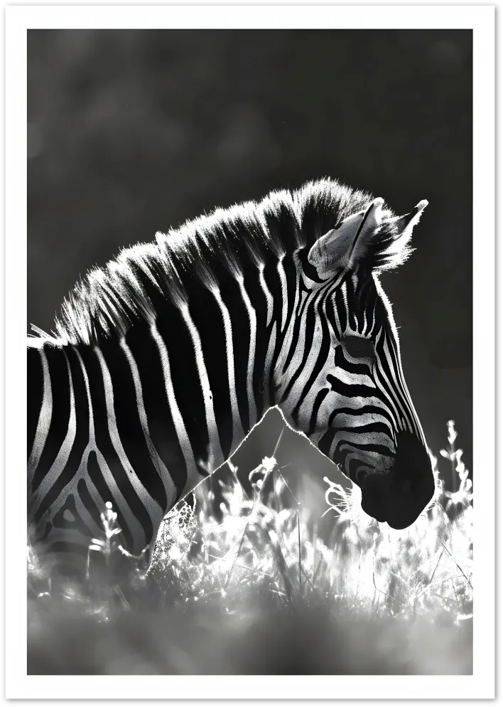 Een zijprofiel van een zebra die oplicht in het tegenlicht van het vroege ochtendgras. Kalm, natuurlijk en sfeervol.