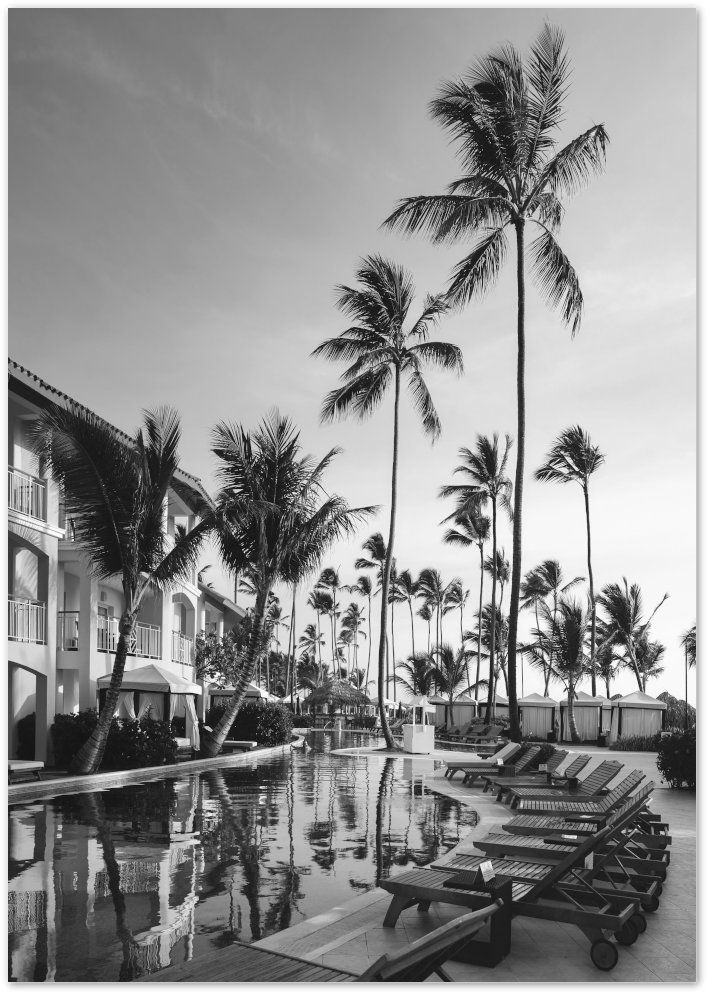 Create a serene holiday atmosphere with this elegant black and white poster featuring tall palm trees, a calm resort pool, and rows of loungers under open skies. The peaceful composition makes this poster a beautiful fit for bedrooms, bathrooms, and interiors that embrace relaxed luxury and timeless travel style.