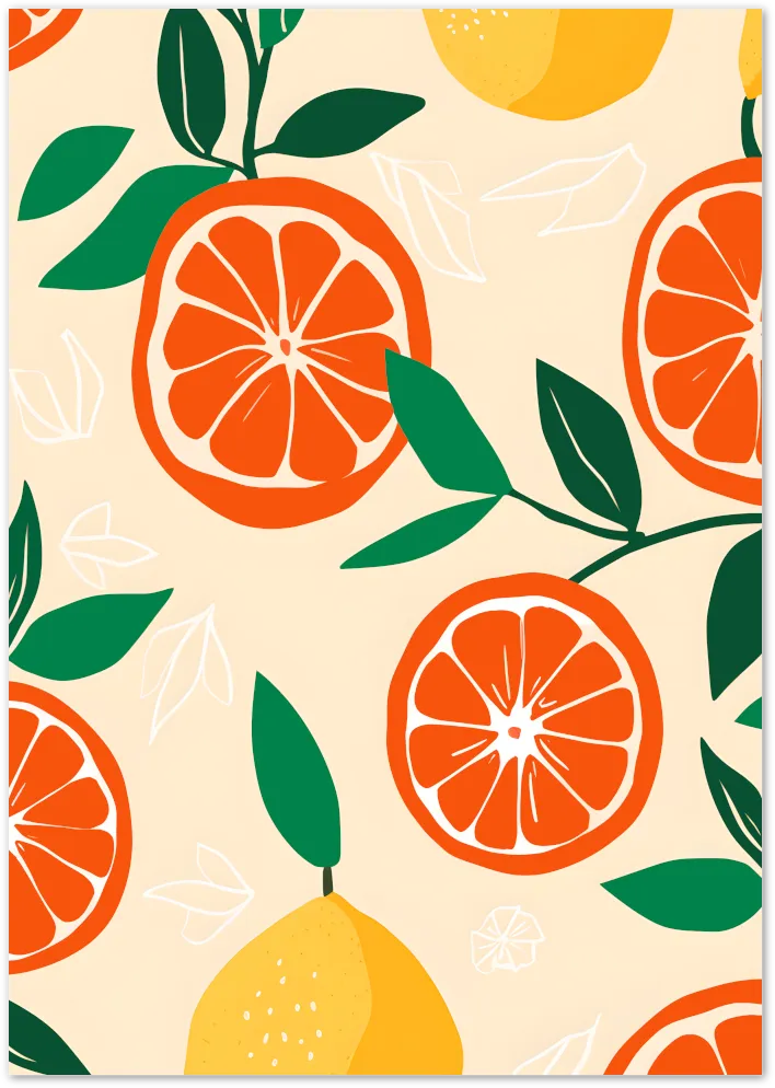 A vibrant botanical design bursting with sliced oranges, lemons, and leafy greens. This playful fruit poster energizes kitchens, dining areas, or creative corners with summer freshness.