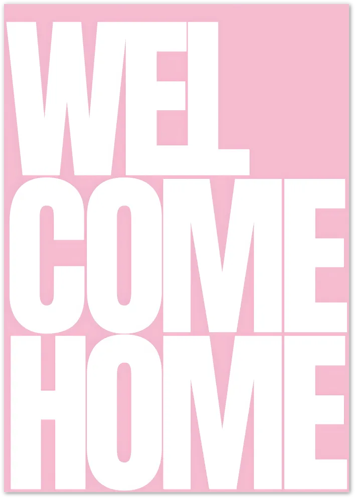 A striking typographic layout in pink and white that simply says “Welcome Home”. Clean, bold, and heartwarming.