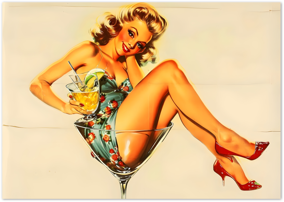 A playful retro poster featuring a classic pin-up illustration seated in a martini glass. With warm tones and vintage charm, this poster brings old-school glamour and cocktail culture together in one irresistible design.