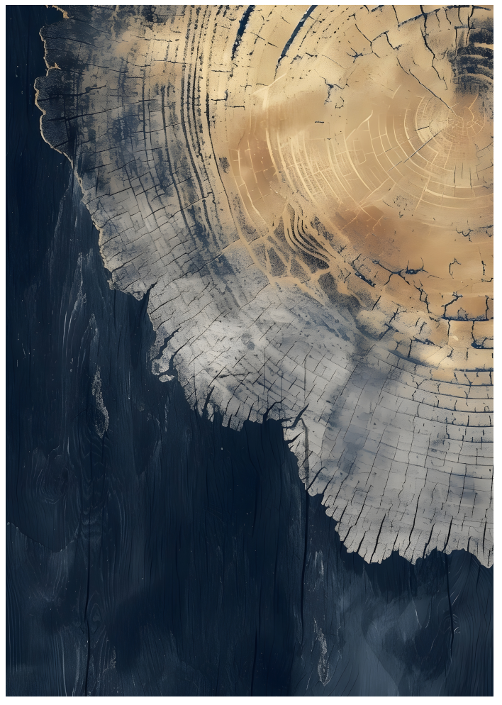 This abstract poster features organic wood textures in deep blue and warm golden tones. The layered structure and natural patterns create a sophisticated and artistic look, perfect for contemporary interiors.